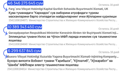 Parametrlarni o‘zingizga moslashtirasiz: qiziqtirgan sohangizni (qurilish, IT yoki uskunalar yetkazib berish) va viloyatingizni (shahar, viloyat yoki butun mamlakat) tanlaysiz. Bu faqat sizga mos keladigan lotlarni ko‘rish imkonini beradi.